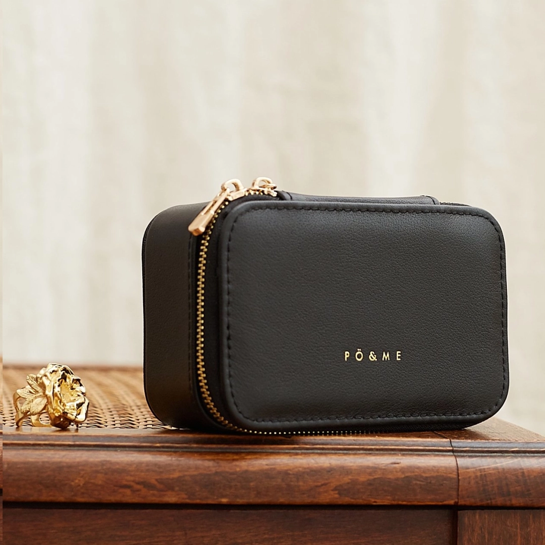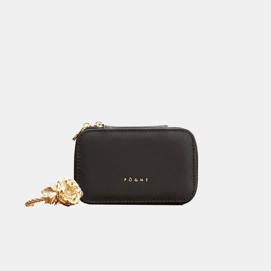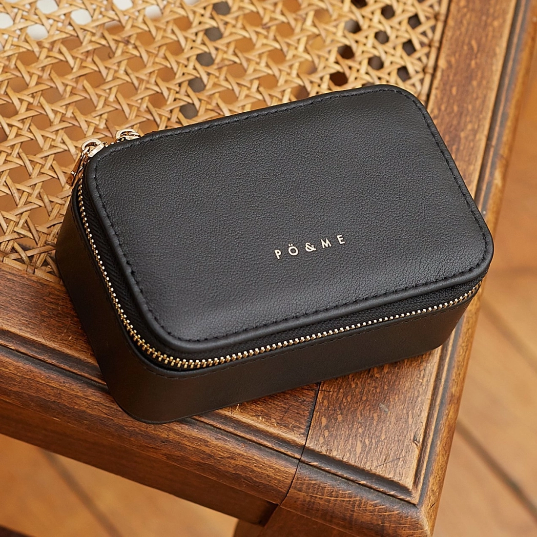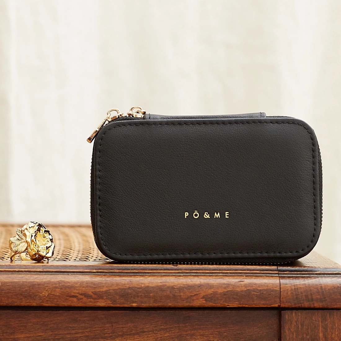 - Extérieur : 100% cuir de vachette lisse, frappé du logo PÖ&ME doré, fermeture zippée dorée