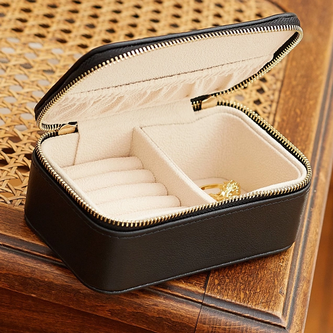 - Intérieur : Peau de pêche façon velours, compartiments organisés pour bagues et bijoux, poche élastique pour accessoires précieux