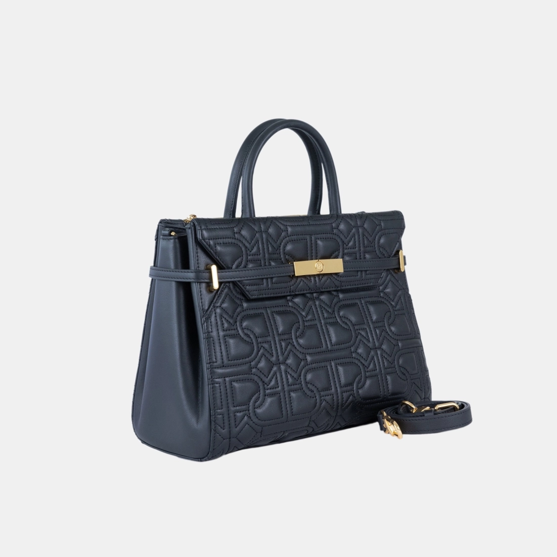 La fermeture par rabat avec sanglons et fermoir magnétique griffé PM assure une protection fiable, tandis que la grande poignée en cuir permet un porté main élégant. Une bandoulière amovible en cuir, ajustable de 84 à 95 cm, offre également la possibilité d’un porté épaule confortable.