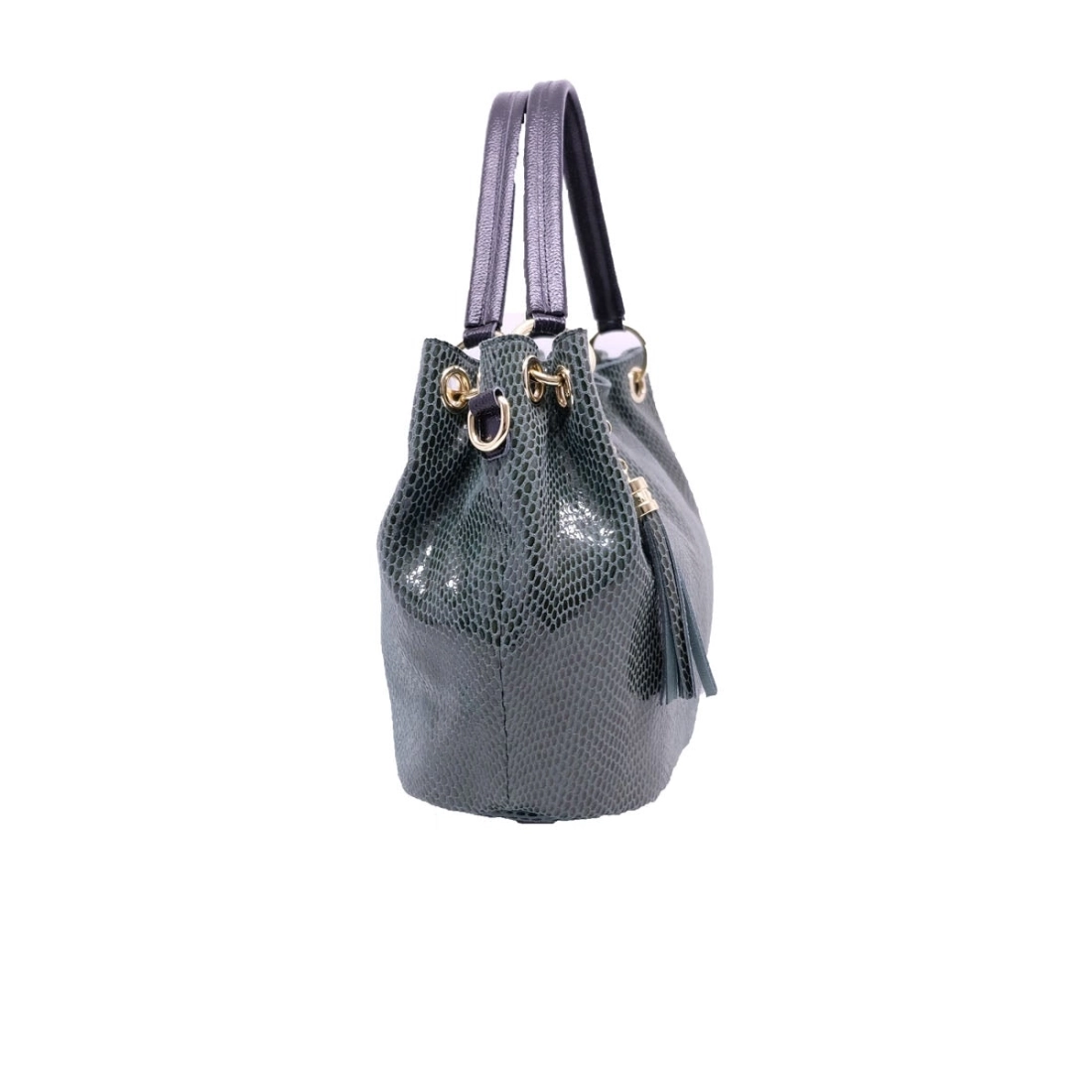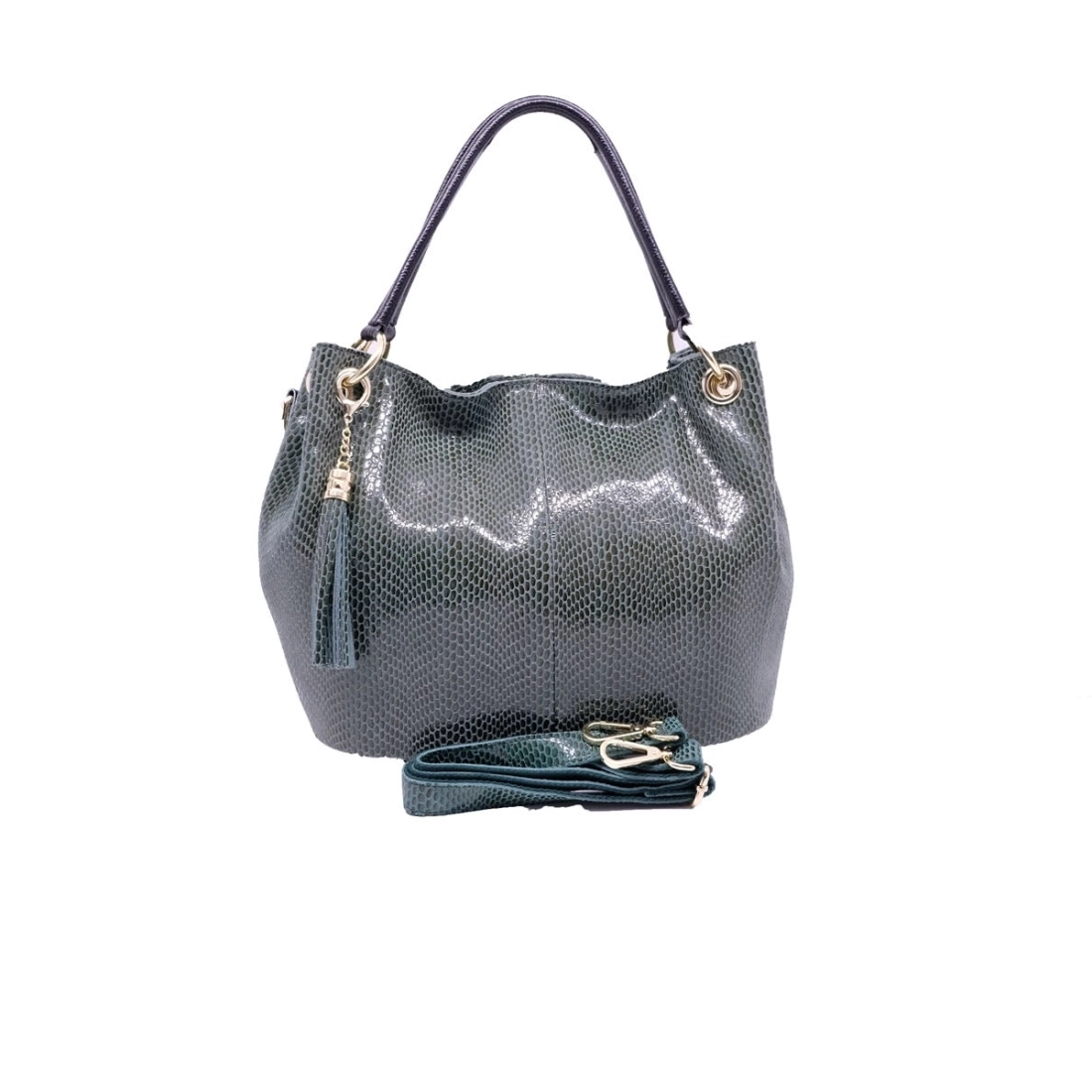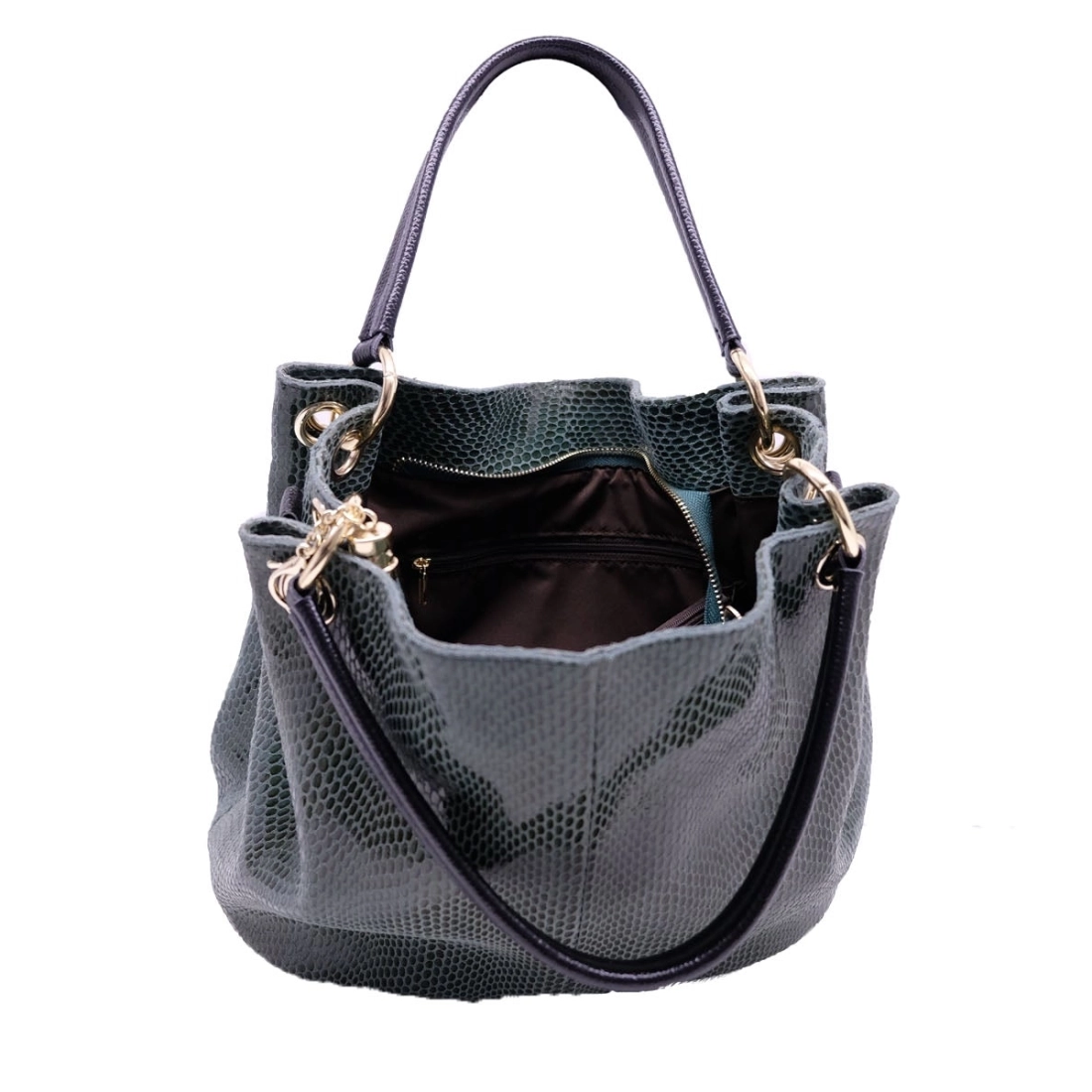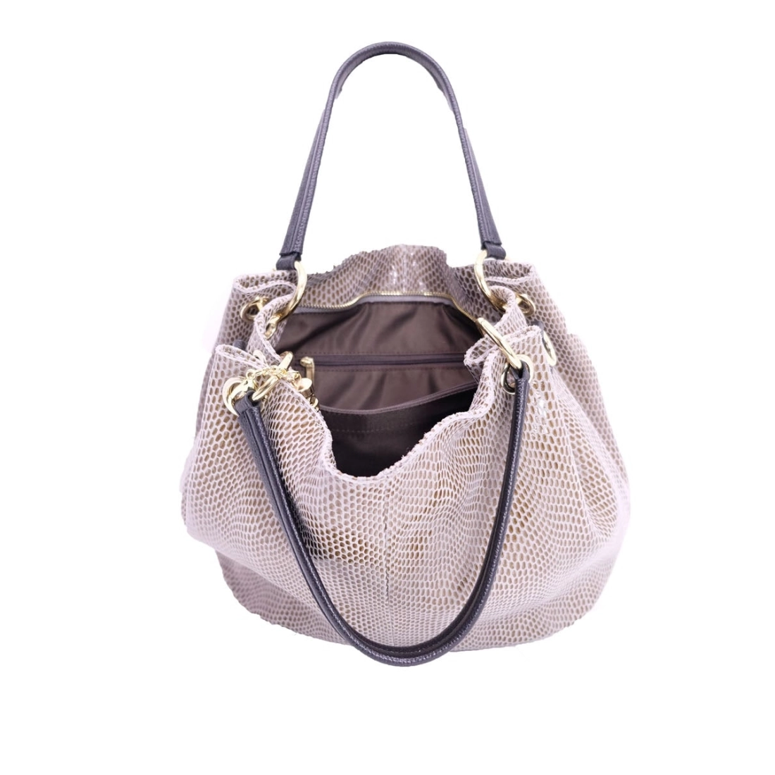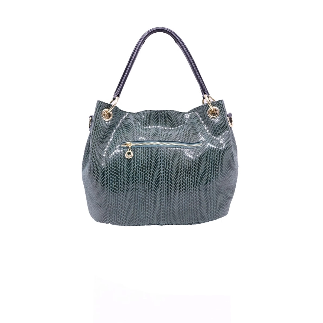 Sac cuir à motif lézard. Anse de cuir grainé, porté à l'épaule. Bandoulière réglable et amovible. Doublure polyester, 4 poches intérieures. Poche zippée au dos, finition dorée. Fermeture zippée.