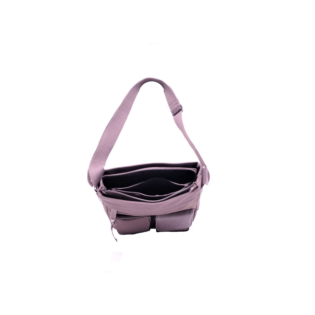Sac en textile avec 3 poches devant, une avec rabat et deux avec protégé par une fermeture à glissière . Bandouliere réglable, doublure textile avec poche zippée. Intérieur, finition canonfusir.
