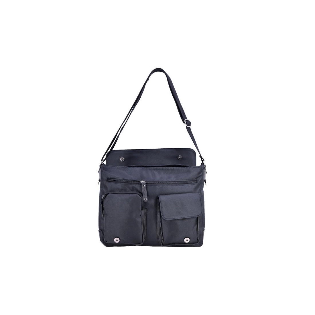 • Description : Sac besace à rabat avec bouton-pression, garniture synthétique. Poche zippée sur le rabat et au dos du sac. Bandoulière réglable en textile, poches zippées à l’intérieur protégées par une fermeture à glissière.