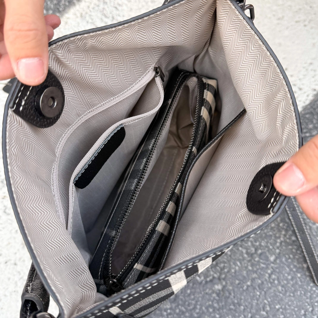 Compartiments : Un espace principal spacieux incluant deux larges poches, une zippée et l’autre plate. Une poche arrière plate est présente pour couronner le tout