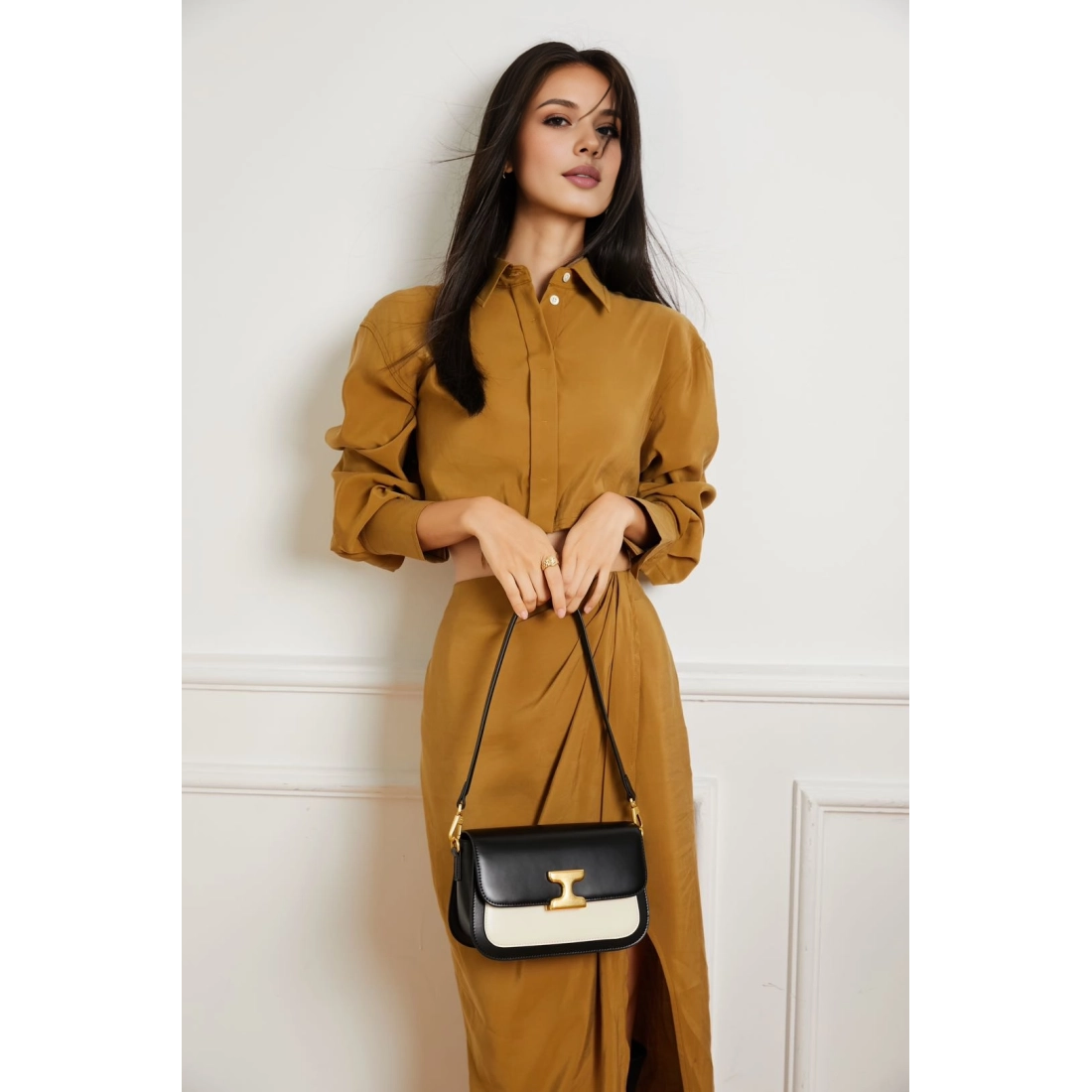 - Une bandoulière dorée amovible et réglable de 93 cm à 113 cm
