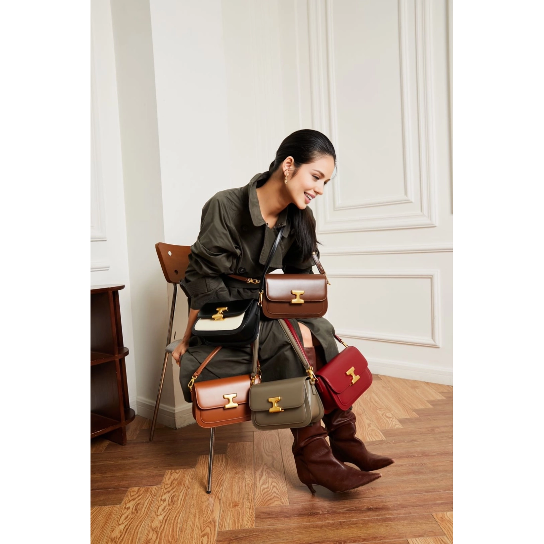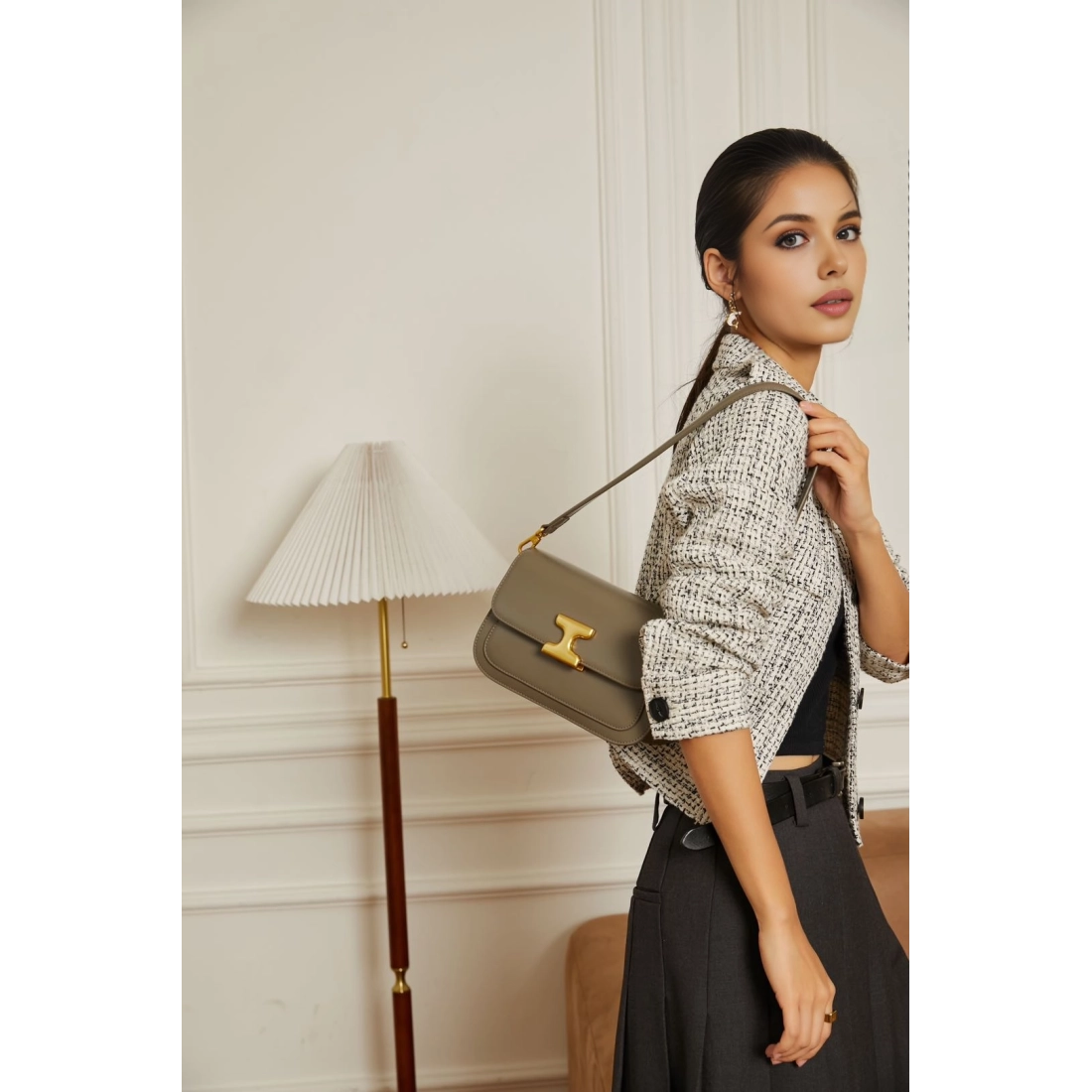 • Une bandoulière dorée amovible et réglable de 93 cm à 113 cm
