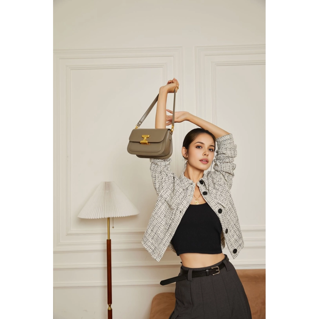 • Une bandoulière dorée amovible de 63 cm