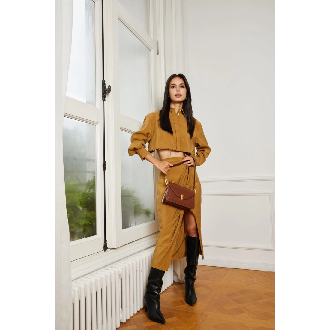 Porté : Élégante bandoulière amovible mi-cuir mi-chaîne dorée en acier...